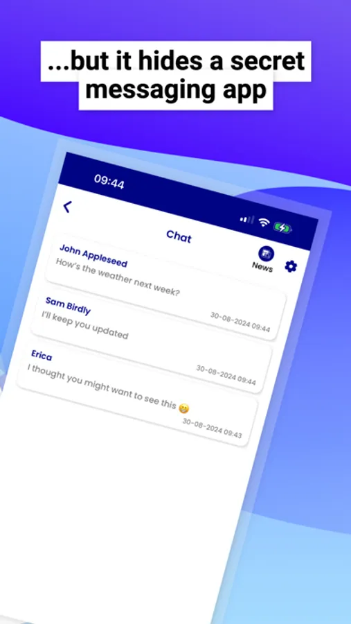 It looks like a News Reader but it secretly hides your confidential chats to make it impossible for prying eyes and hackers to discover your conversations.