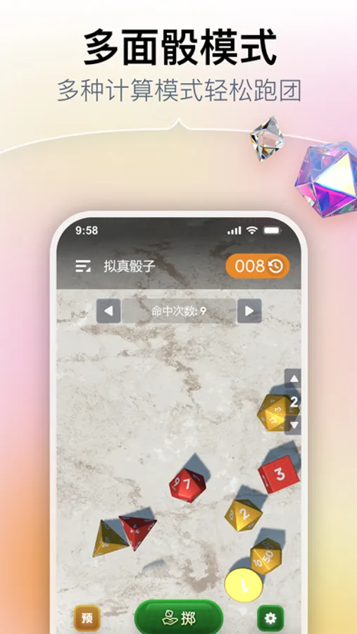 【多种功能】骰蛊模式、投掷模式、多面骰模式、测手速、性能跑分等。