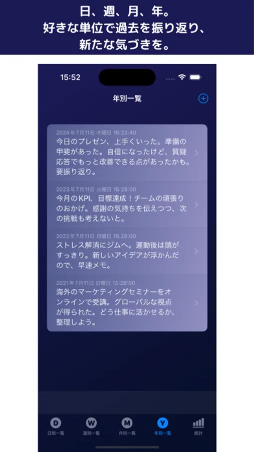 You can look back on the past in various axes by displaying diaries sorted by daily, weekly, monthly, and yearly.