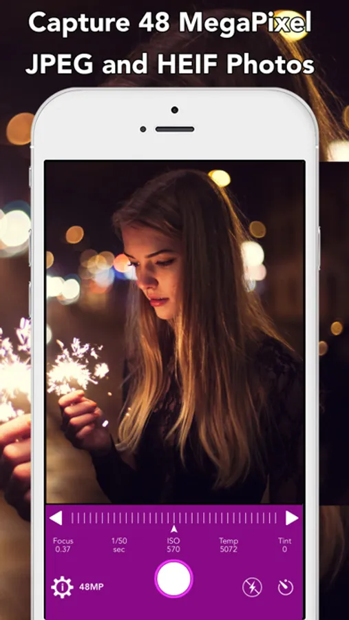 Capture lightweight super high resolution photos 48 megapixel photos saved in JPEG or HEIC formats. Have a full control over the camera and manually adjust the focus, shutter speed, ISO, temperature and tint to capture amazing photos.