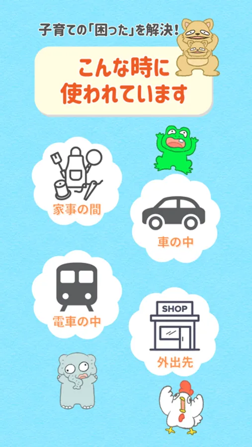 「いないいないばあっ!」は、赤ちゃんが画面上の動物たちをタッチするだけで、キャラクターたちが「いないいないばあ」をしてくれます。これにより、お子様は動物たちの可愛い声や表情に反応し、笑ったり、驚いたり、真似したりして遊ぶことができます。お子様に「驚き」と「ワクワク」を提供するアプリです。