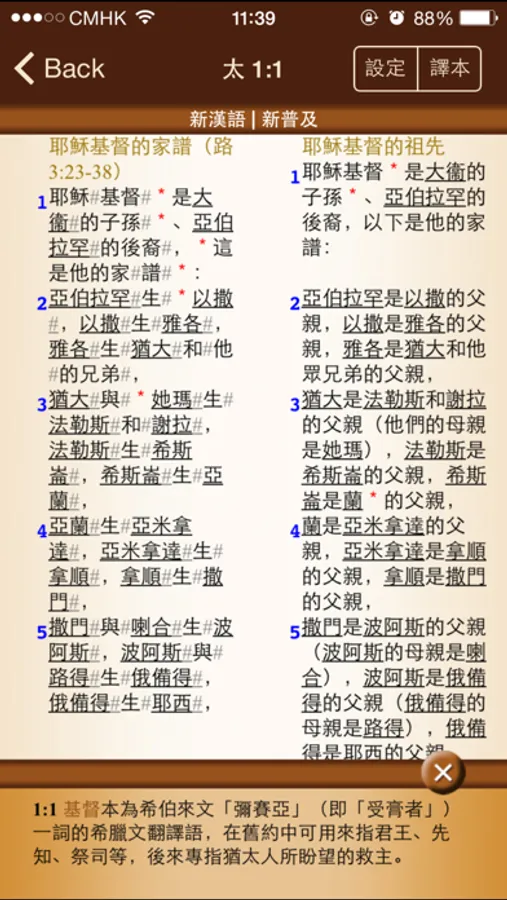‧ 左右視窗顯示模式:兩視窗經文同步顯示,方便比對兩個譯本的字詞。