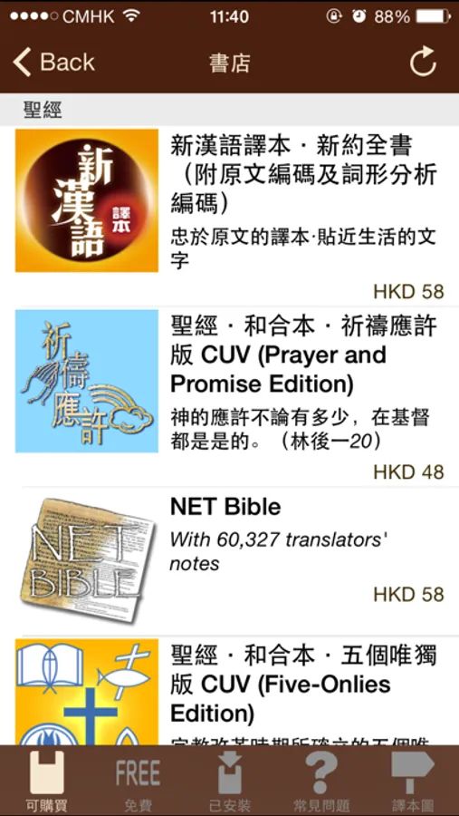 ‧ 書店:購買或免費下載不同項目,並會不斷增加不同版本的聖經、字典、附註及靈修讀經等資料。所有已購買的項目都是與Apple ID帳號連結,只須購買一次便可在同一帳號的不同iOS設備上使用,就算刪除了購買項目,也可以重新免費下載。