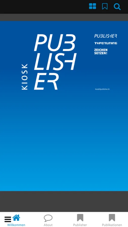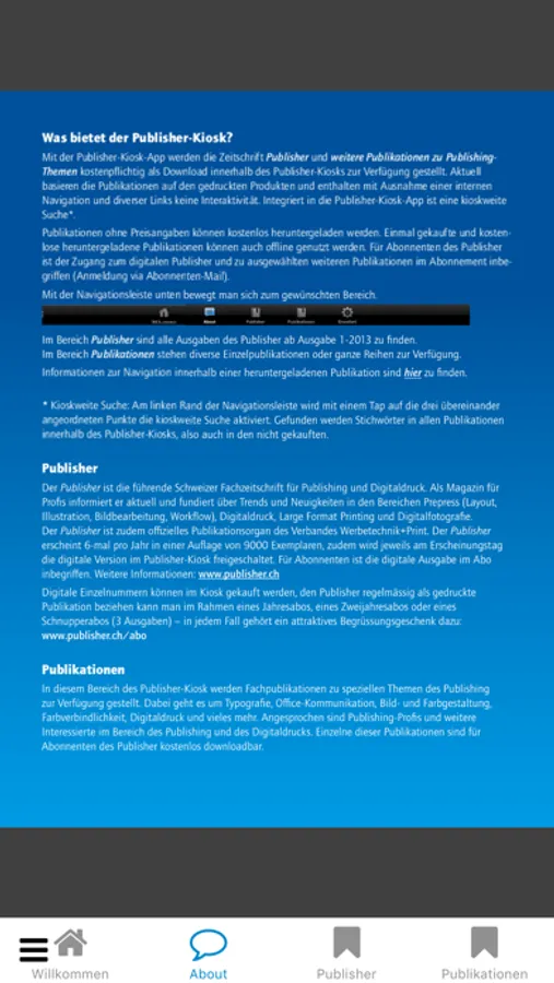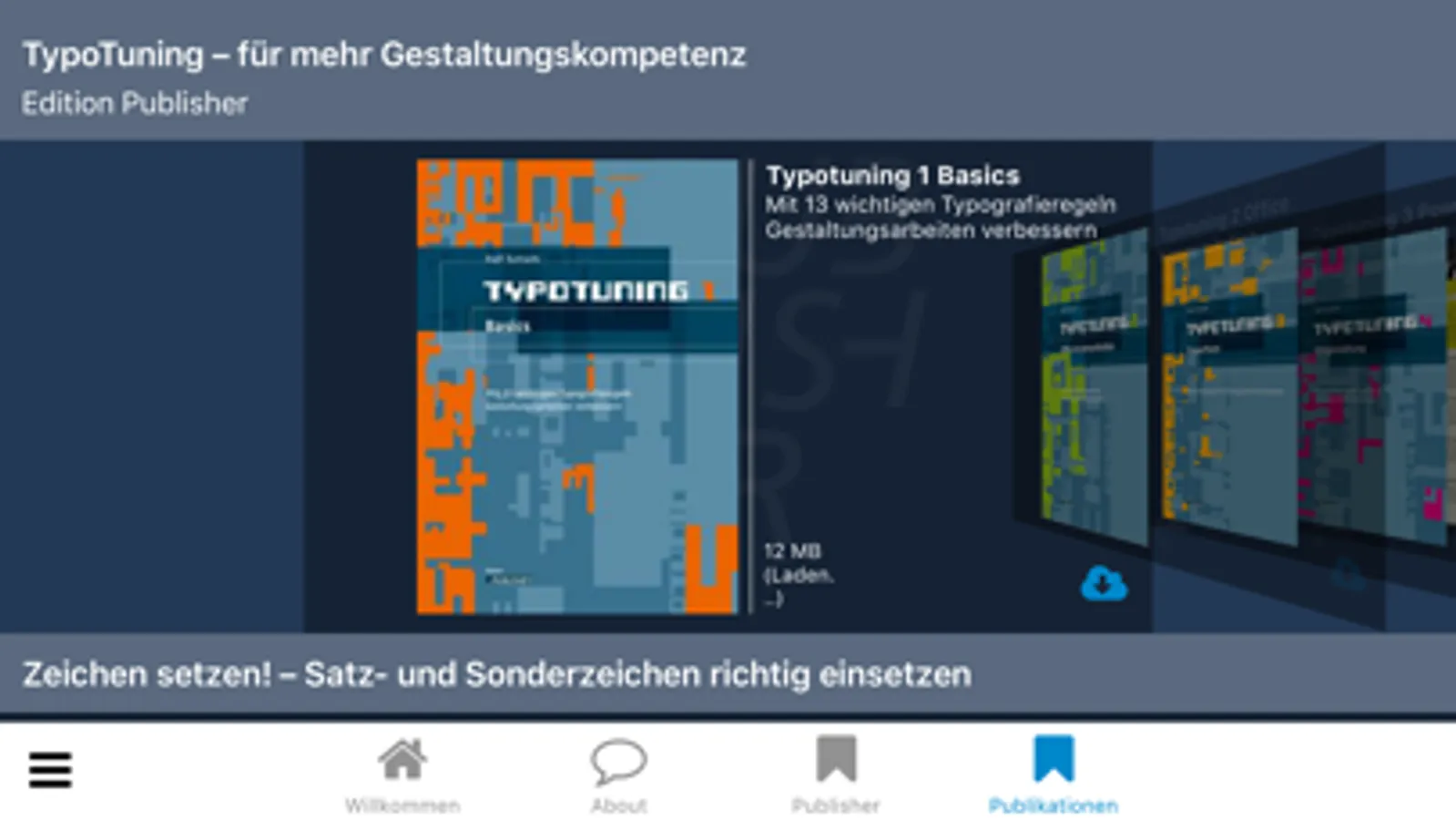 Mit der Publisher-Kiosk-App werden die Zeitschrift Publisher und ausgewählte Titel der Edition Publisher als kostenpflichtig downloadbare Publikationen zur Verfügung gestellt. Den Anfang macht die Reihe TypoTuning. Aktuell basieren alle Publikationen auf den gedruckten Produkten und enthalten mit Ausnahme einer internen Navigation und ein paar weniger Links keine Interaktivität.