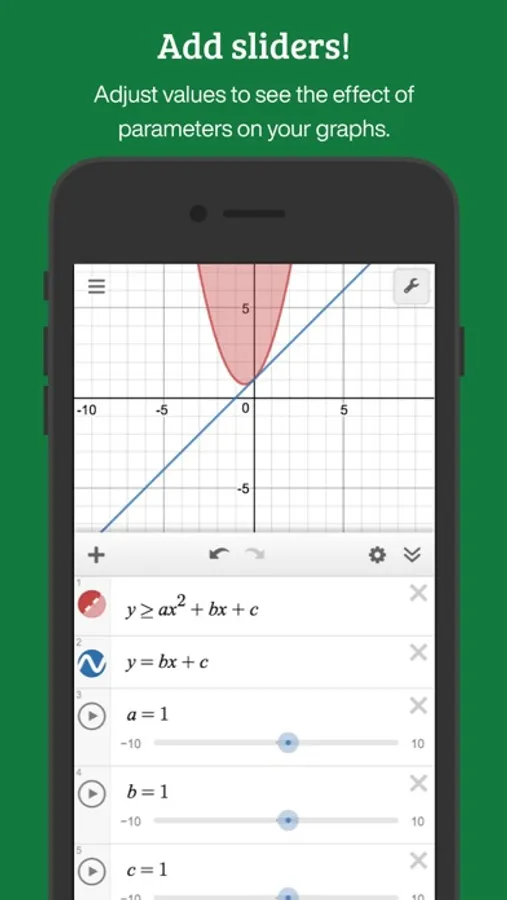 Sliders: Adjust values interactively to build intuition, or animate any parameter to visualize its effect on the graph.