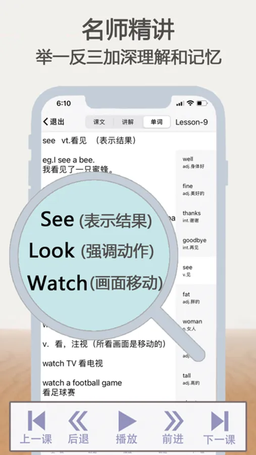 本软件支持文本音频同步朗读,点击句子发音,滑动控制进度,锁屏之后继续播放,中文讲解,更多精彩内容请下载体验。