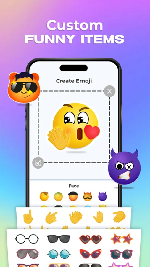 - Design your emojis with various items, including eyes, mouths, accessories, and more.