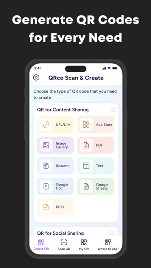 - Create QR codes for various purposes (websites, contacts, Wi-Fi, files, social media, business, location, menu lists, payments, ratings & reviews and more)