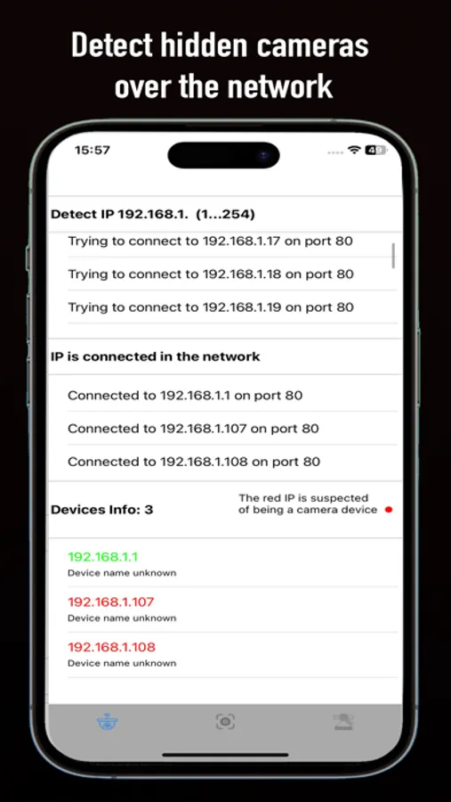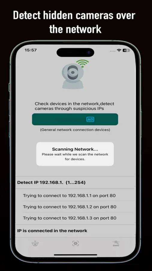 "Hidden Camera Detector, Scan IP" is an essential app designed to help you locate hidden cameras and devices in your surroundings. With its advanced scanning technology, it can detect various types of hidden cameras, and other surveillance devices. The app also features IP scanning capabilities, allowing you to identify unauthorized devices connected to your network. Easy to use and highly reliable, "Hidden Camera Detector, Scan IP" ensures your privacy and security in both personal and professional environments. Download now to stay protected.