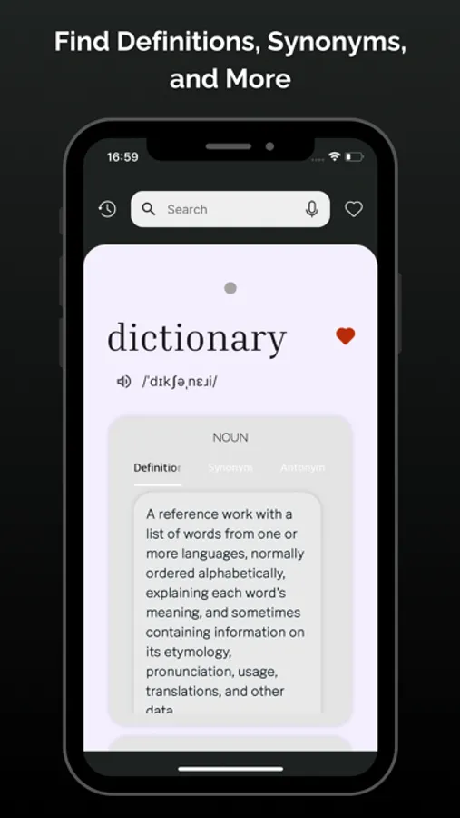 - Extensive Vocabulary: Access definitions, synonyms, and antonyms for thousands of words.