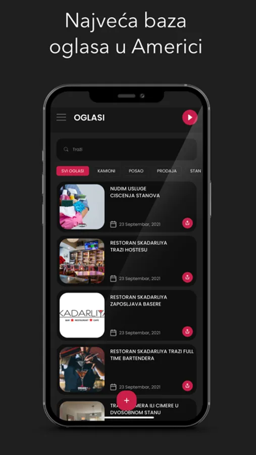 - OGLASI - ukoliko tražite stan, cimera, posao...posetite najveću bazu oglasa u Čikagu. Dodavanje oglasa nikada nije bilo jednostavnije sa obzirom da smo u listi OGLASI. u desnom donjem uglu ekrana, dodali plus dugme za dodavanje oglasa.