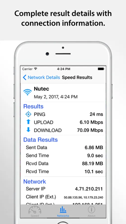 – Simple, one button tap performs (or cancels) the internet speed tests.