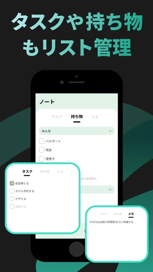 旅行に向けたタスク・持ち物・メモを登録できます。