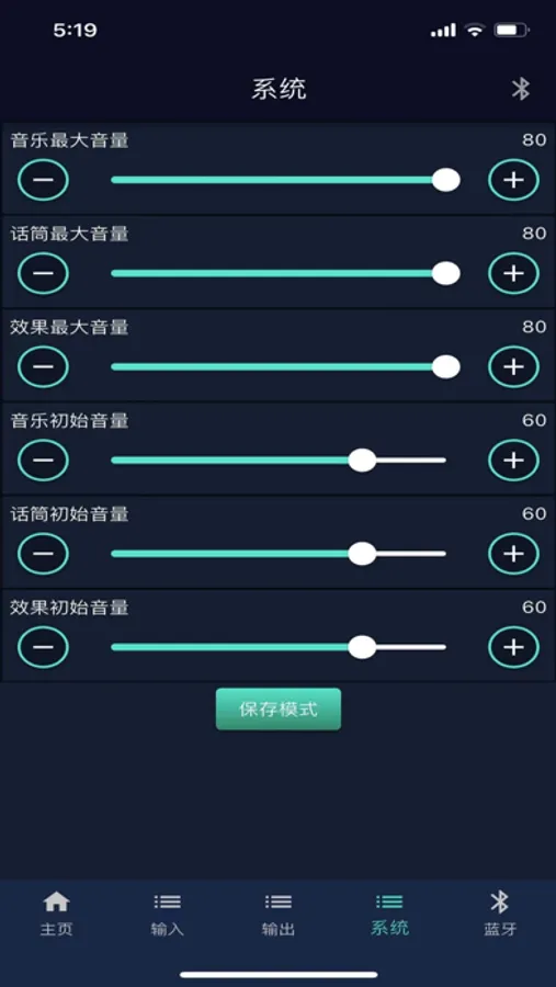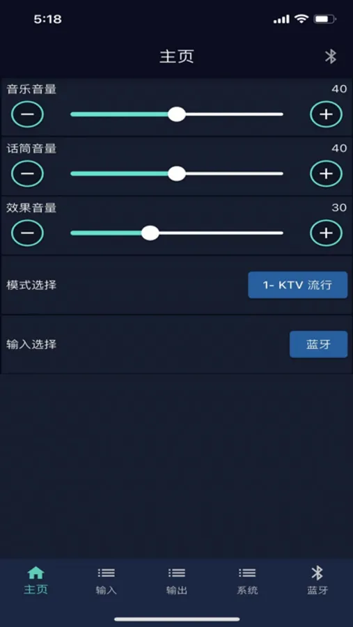 手机通过蓝牙连接到相应的设备,可以调节设备参数,比如:音乐音量,麦克风音量,效果音量,音乐EQ,麦克风EQ,回声与混响的参数,输出音量,音频输入源,用户模式等。