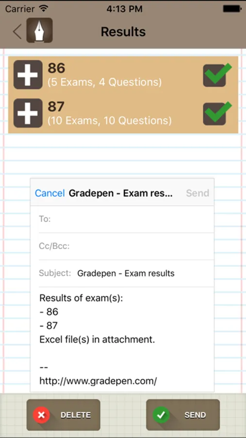 The objective questions are graded automatically with this App using your device's rear camera. The teacher may also inform the grades of open-ended questions to be totaled in the final test score. You can export the results to a spreadsheet and forward it by email.