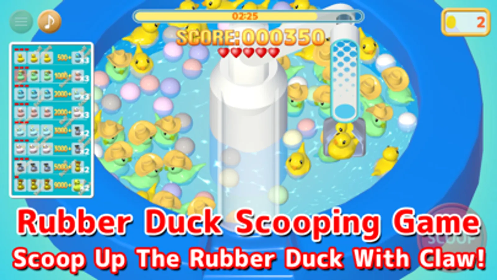 In this game, you can enjoy scooping ducks floating in the pool. It's a fun combination of ball scooping and crane games.