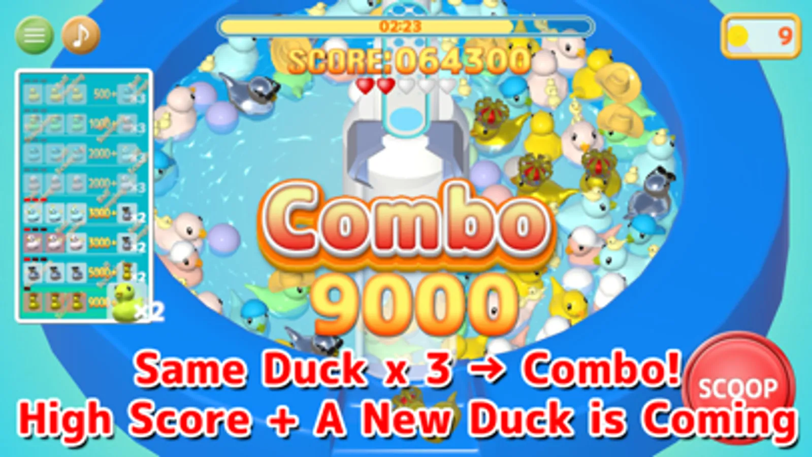 You get points when you scoop up a duck. Scoop up the same duck three times for a combo. You get a higher score and a new duck will come in.