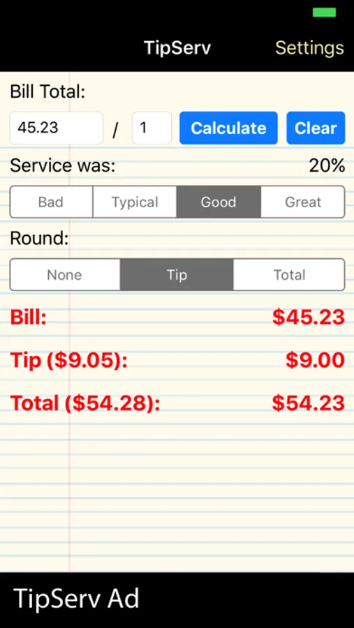 TipServ is an easy to use tip calculator that will figure out the tip amount however you pay your bill. It will round the tip for cash tips or it will round the total for quick whole number cash payments. It will even allow you to split the check multiple ways.