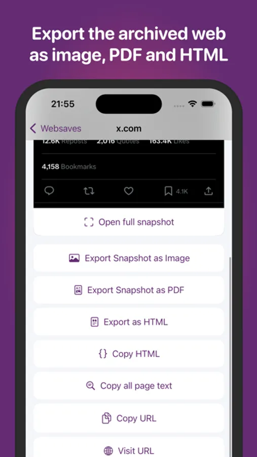 - Flexible export options: Export your saved web pages as PDF, image or HTML. Choose the format that works best for you.