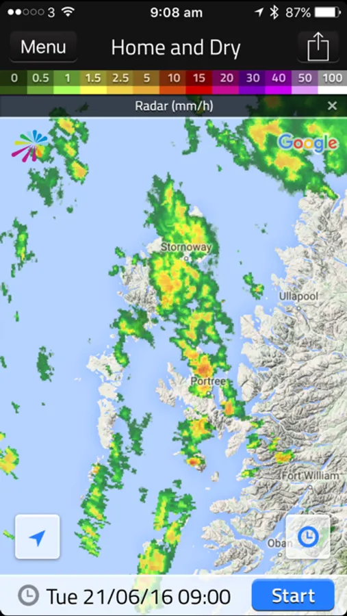 • The very latest rain radar information animated at 5 minute intervals for the previous 2 hours overlaid on a fully zoomable map