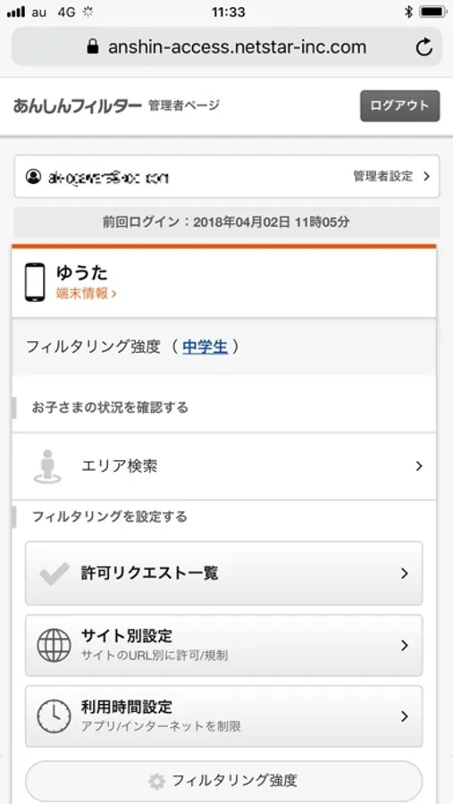フィルタリング強度はお子さまの学齢に合わせて「小学生」「中学生」「高校生」「高校生プラス」の4段階から設定できます。 利用したいサイトがある場合は、個別に許可することもできます。