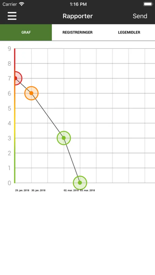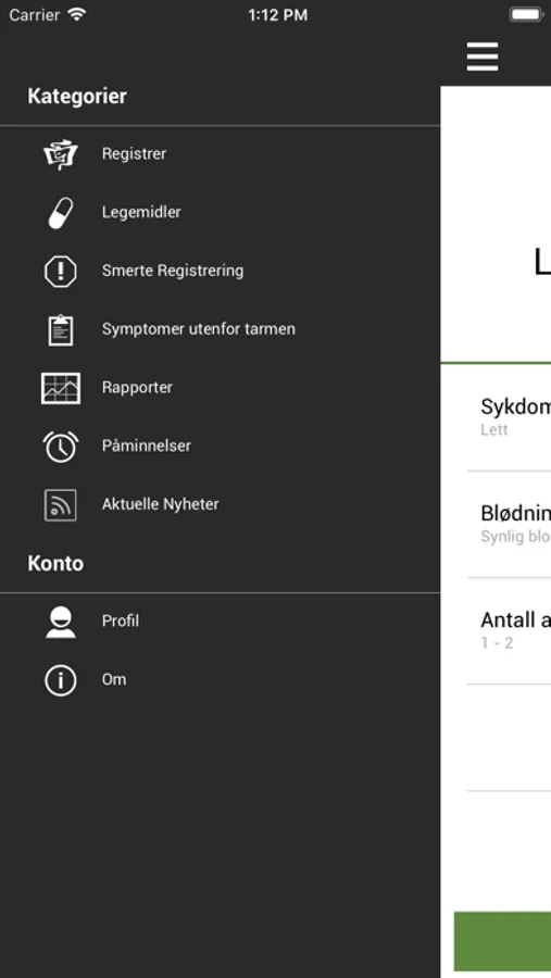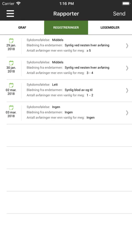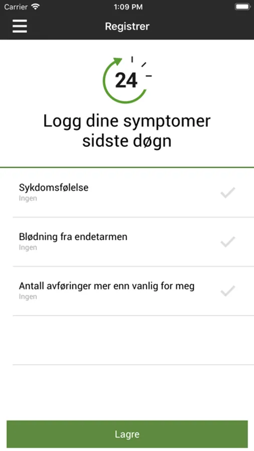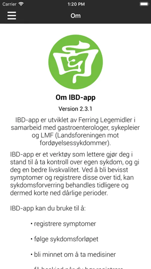 Her kan du registrere symptomer og legemiddelbruk/dosering. Følg sykdomsforløpet og bli minnet om å ta medisiner samt å sende inn fekaltest. Få beskjed når du bør registrere symptomer igjen og når du bør kontakte lege/IBD-sykepleier på bakgrunn av symptomer. Send rapport om sykdomsforløpet med e-post og skriv den ut. IBD-app er utviklet av Ferring Legemidler i samarbeid med gastroenterologer, sykepleier og LMF (Landsforeningen mot fordøyelsessykdommer).