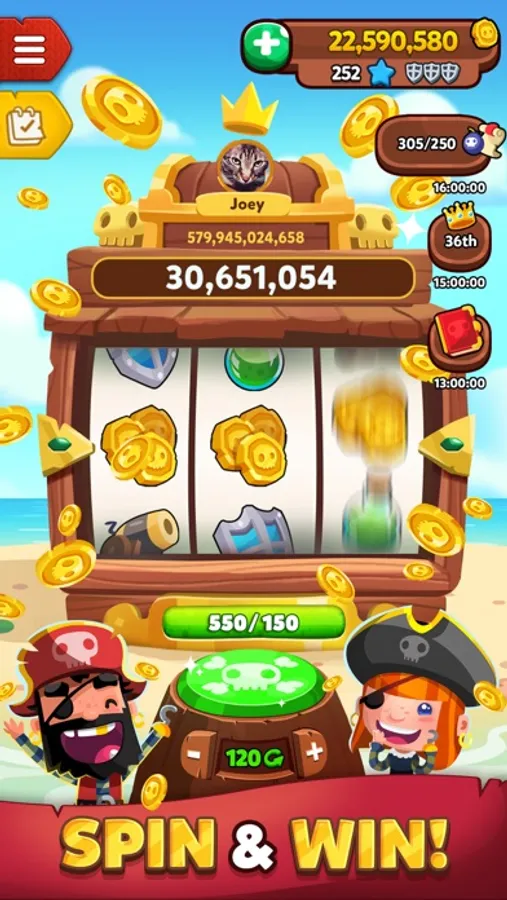 - Spin, win coins, and use them to upgrade your pirate island for brand new goodies.