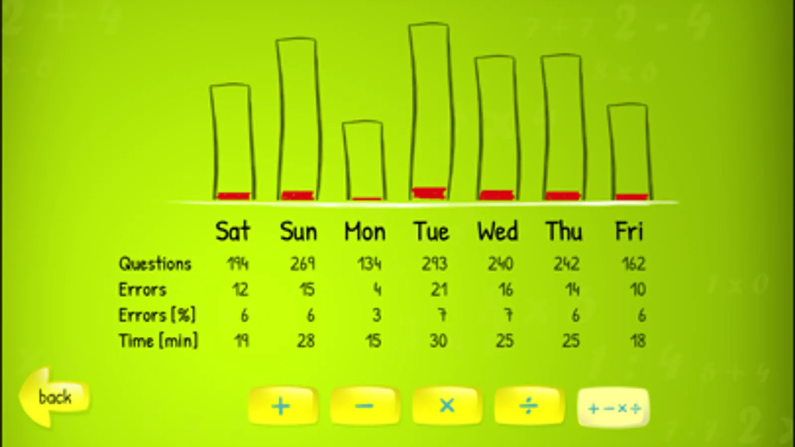 Do you want to know if your child practised her maths yesterday and whether she is improving? View detailed statistics of time spent in the application, number of problems solved and errors!