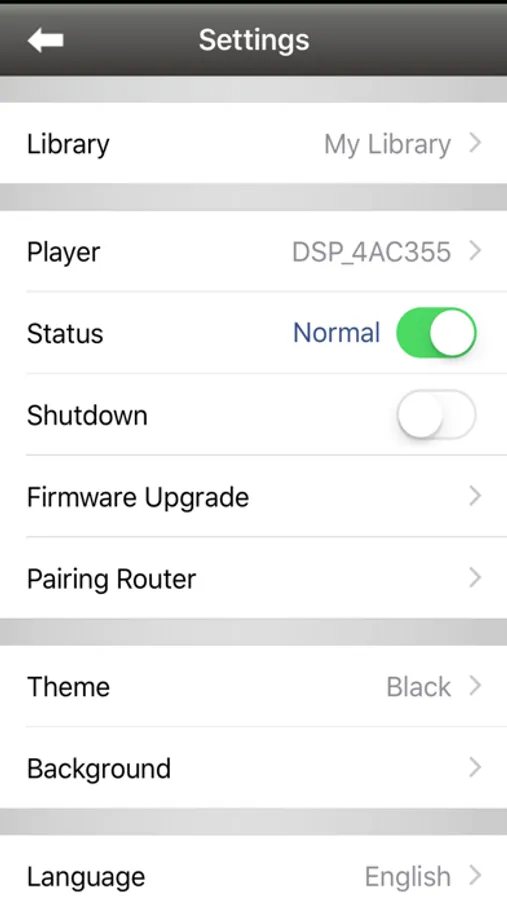 2. At the setting page, choose the music library (either from iOS device or server) and the player (music playing devices).