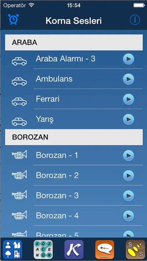 Korna Sesleri mobile uygulaması ile korna sesleri artık cebinizde. Alarm sesi olarak ayarlama özelliği. Yapmanız gereken tek şey, uygulamayı ücretsiz olarak telefonunuza indirmek!. Araba korna sesi, Gemi, Tren, Uçak, Ambulans, Siren, Borozan ve Alarm sesi olmak üzere 55 farklı ses bulunmaktadır.