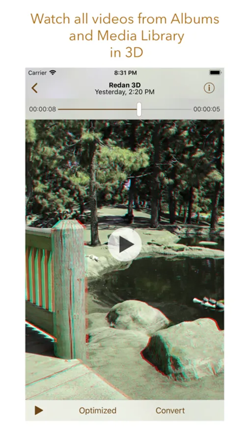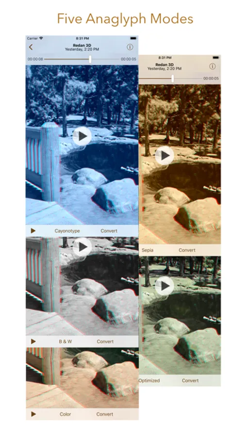 - Offers several 3D mode filters: Color, Optimized, Sepia, Cyanotype and Black and White