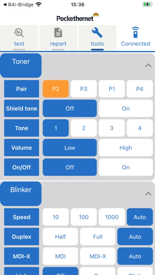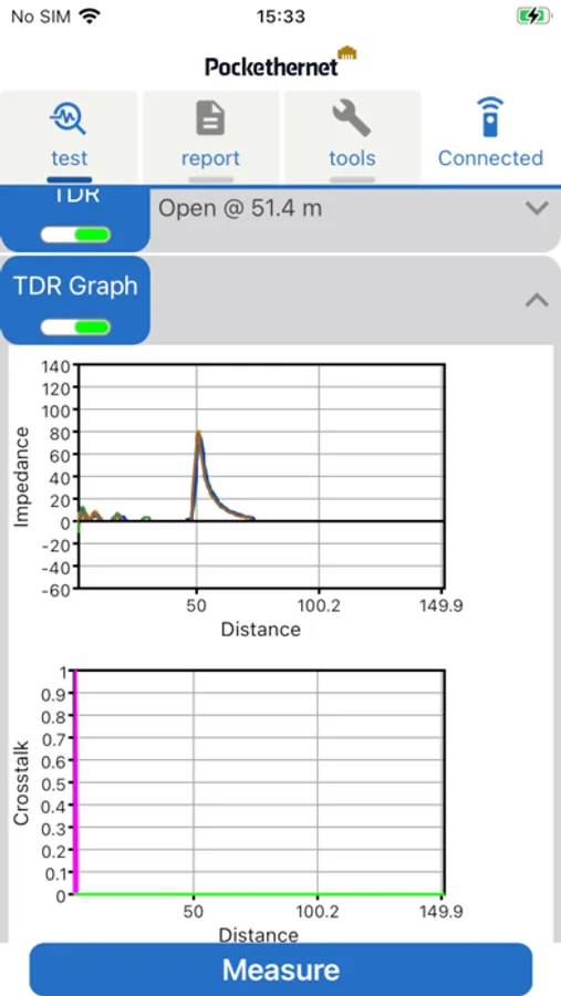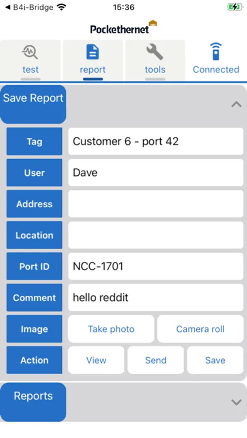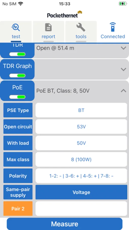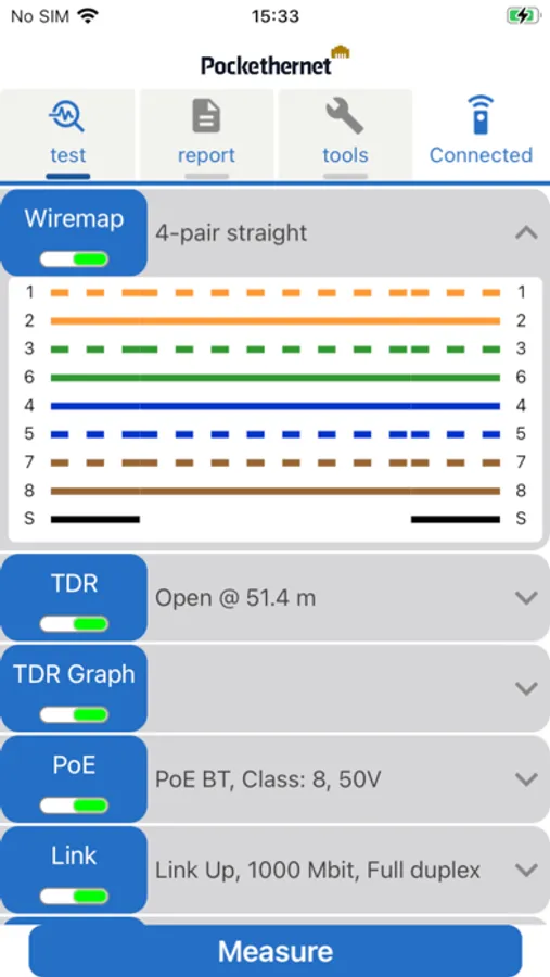 The app enables you to make measurements with the Pockethernet device, remote control every function and generate a report of your findings.