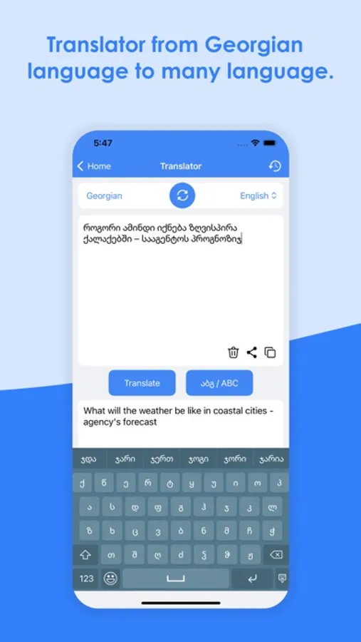 Georgian Keyboard and Translator app provides a dedicated Georgian keyboard that allows users to effortlessly type in the Georgian script. It includes all the characters and symbols needed for accurate and efficient Georgian text input. The app predictive text features help users type with greater accuracy and speed, reducing typing errors.