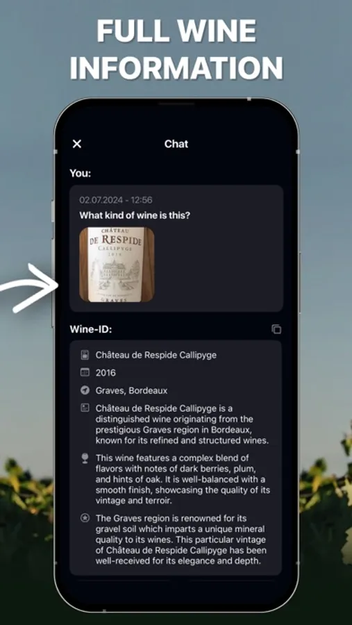 Built on a chat principle, you send a photo of the wine and can ask additional questions. No need to worry about experts laughing at your choice - there’s no human factor. Only essential facts and interesting details about your wine.