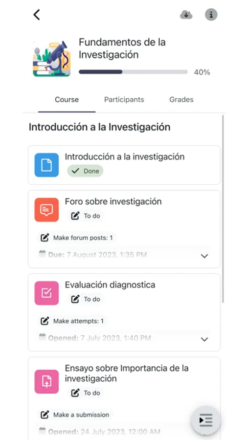 Aplicativo móvil que permite a los estudiantes completar sus actividades académicas en línea y dar seguimiento al proceso de los cursos.