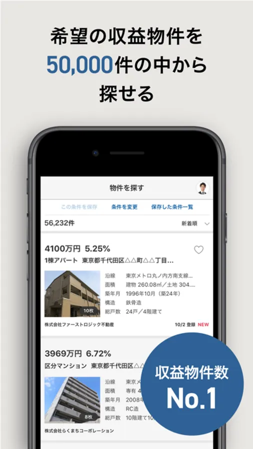 50,000件以上(※2)の掲載物件から、物件種別、価格、利回り、築年数などお好みの希望条件で収益物件を探すことができます。