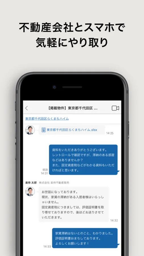 不動産会社とは、アプリ内でメッセージをやり取りすることができます。メッセージの受信はプッシュ通知でお知らせするので、届いたメッセージを見逃しません。