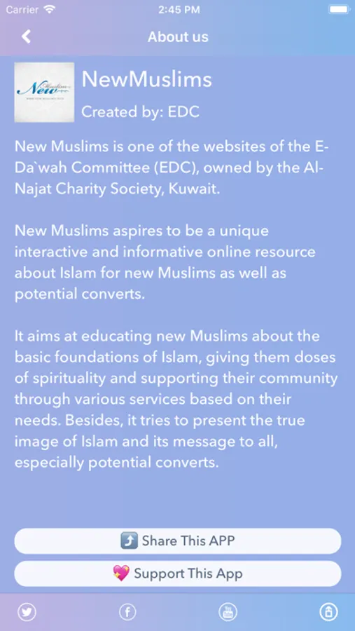 New Muslims' App is one of the applications developed by the E-Da`wah Committee (EDC), owned by the Al-Najat Charity Society, Kuwait.