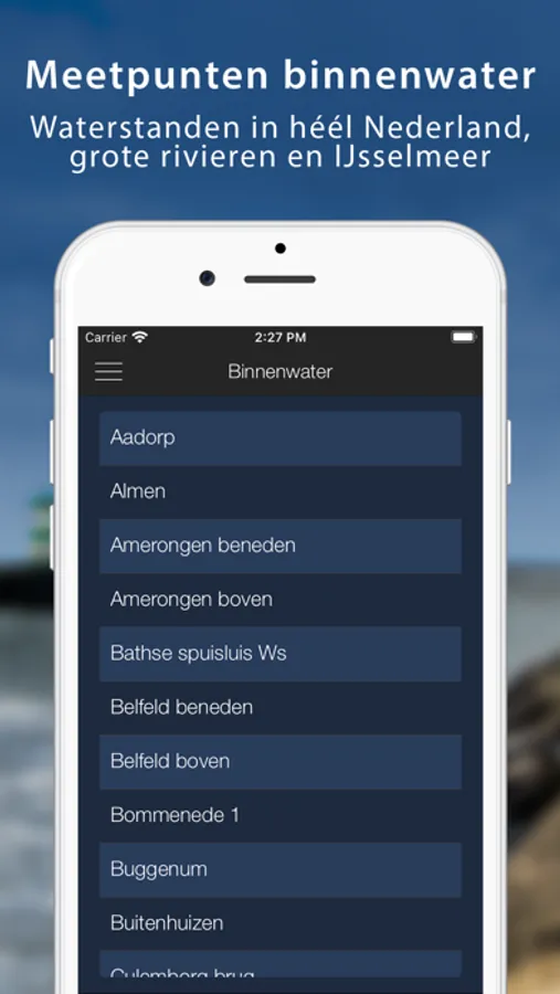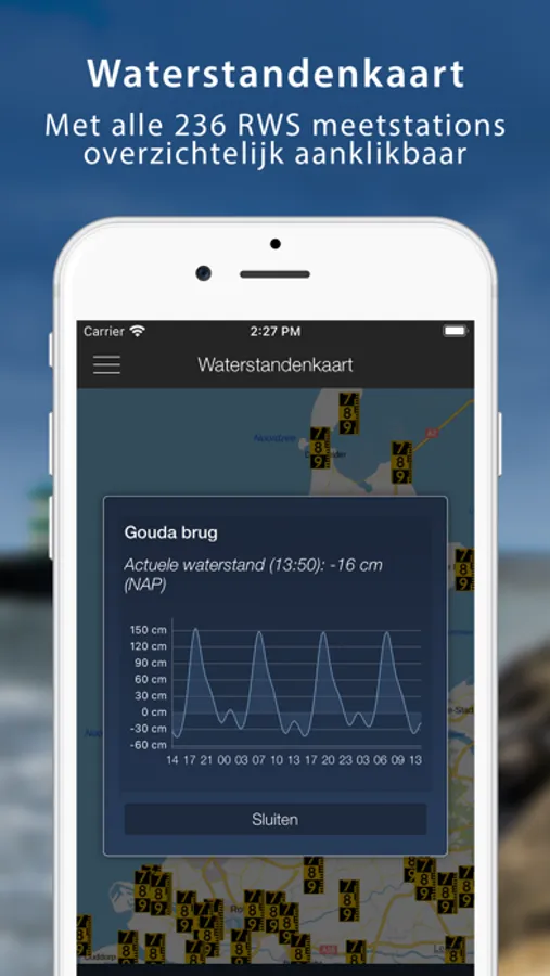You can store your favorite measurement points, and check the sea level variations of all measurement points of in The coastal waters of the Netherlands, the North Sea and all large inland water bodies and rivers.