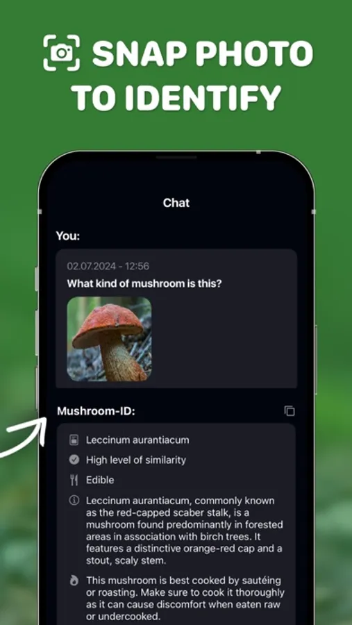 Identify any mushroom within moments! Our state-of-the-art AI scanner accurately recognizes a wide variety of mushroom species. Simply take a photo, and the app will provide you with the name of the mushroom and interesting facts about it. It's the perfect companion for mushroom hunters, botanists, and nature lovers.