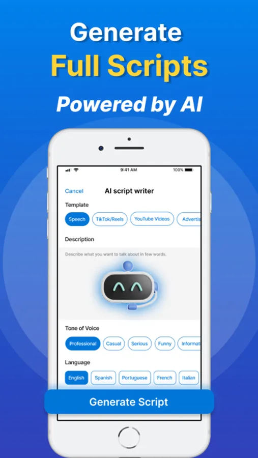 Simply input or generate your script using the AI Script Generator. Adjust the settings for scrolling speed, font size, and mirroring if needed. Start recording with Teleprompter Video Recording, and let the app display your script while keeping your eye line aligned with the camera. Once recorded, the app uses AI Video Captions to create professional subtitles instantly, ready for sharing.
