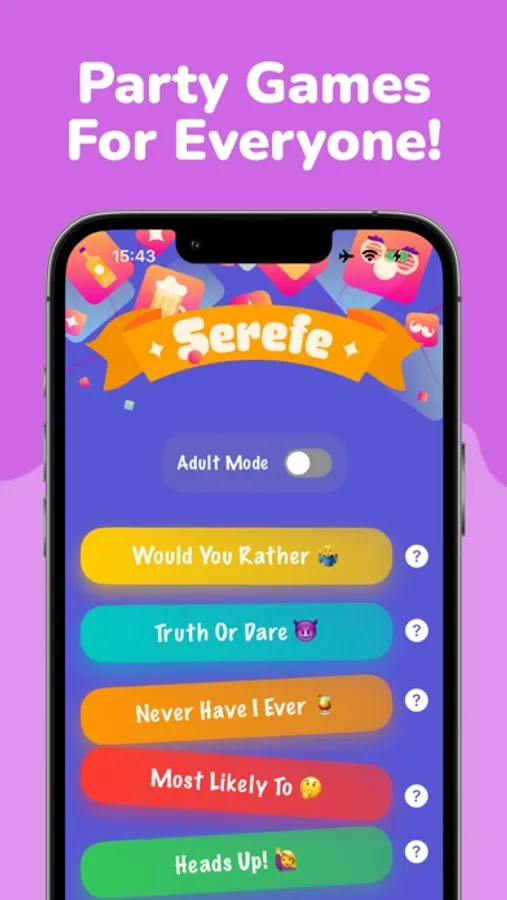 Serefe Party Games brings the ultimate fun to your gatherings! Enjoy a wide variety of games like Truth or Dare, Would You Rather, Heads Up, and many more. Perfect for family game nights, parties with friends, and every social occasion. Unlock all games with our premium subscription and enjoy an ad-free experience.