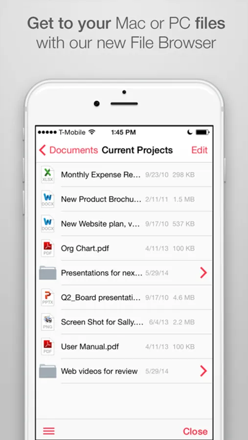One simple tap and you are securely connected to your computer. Quickly navigate thru the hard drive to find the document or photo you need using our file browser; and copy or open it with just a tap.