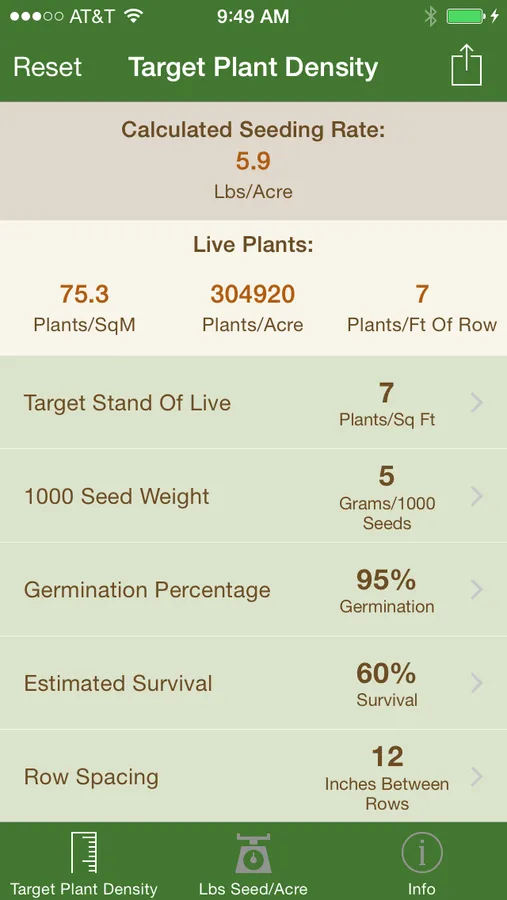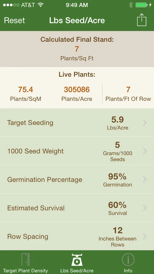 • Outputs estimated seeding rate, final stand, live plants per square meter, acre, and foot of row.