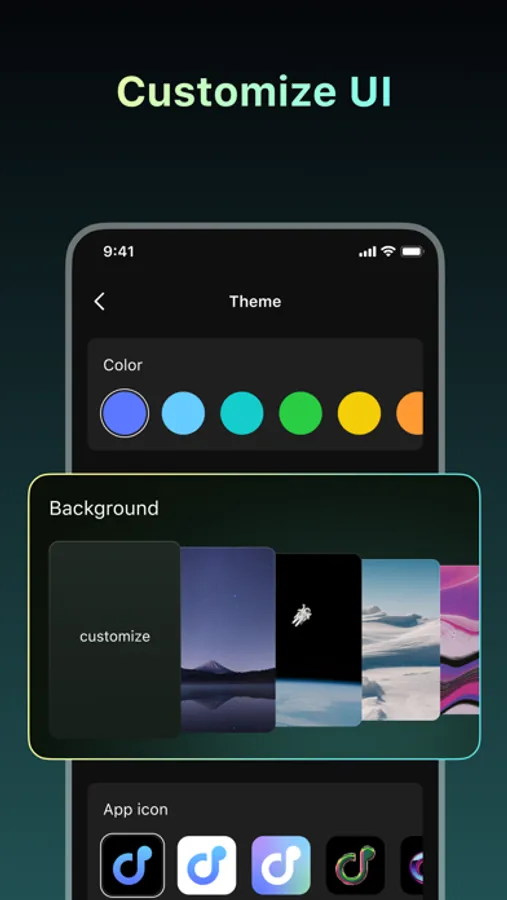 - Create a unique music player mp3 player by personalizing the interface theme color, background image, and app icons.