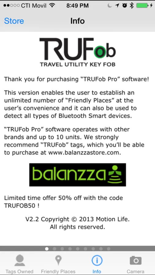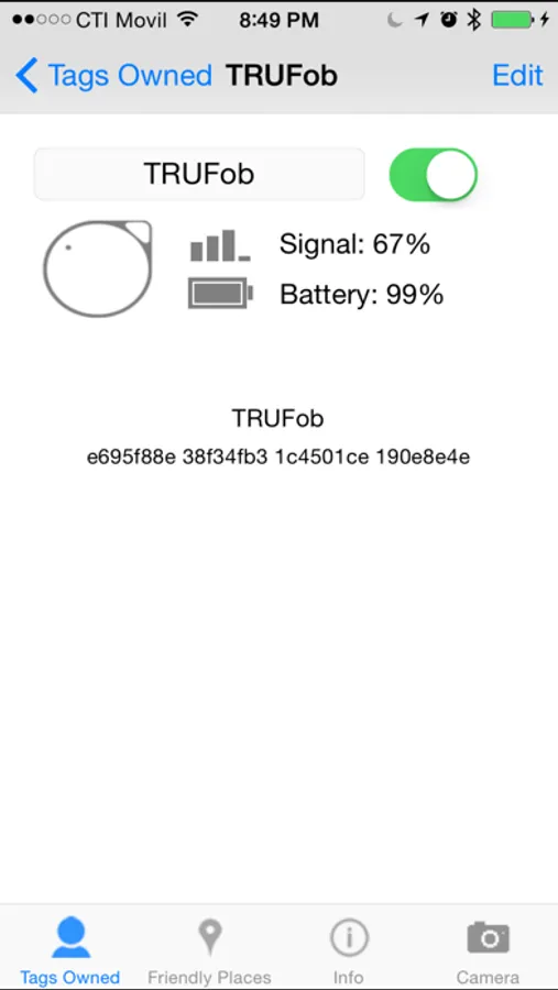 This version offers: Camera Remote Control, Only 1 tag not TRUFob brand, shows the device name, signal strengh (RSSI) and battery level.