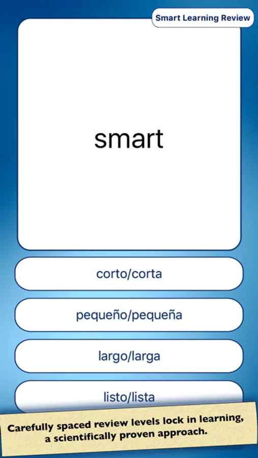 ¡Hola! Help your child boost her Spanish with this fun quiz app. Each time she plays, the app selects progressively more challenging questions from a database of over 500 English-to-Spanish translations. Study hard y es possible que you will top our Spanish Leaderboard. ¡Vámonos!