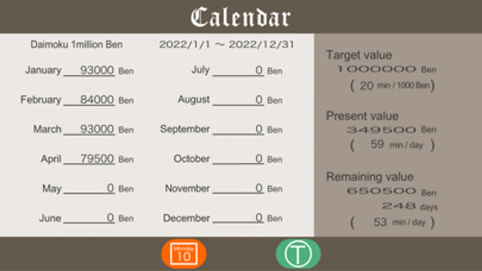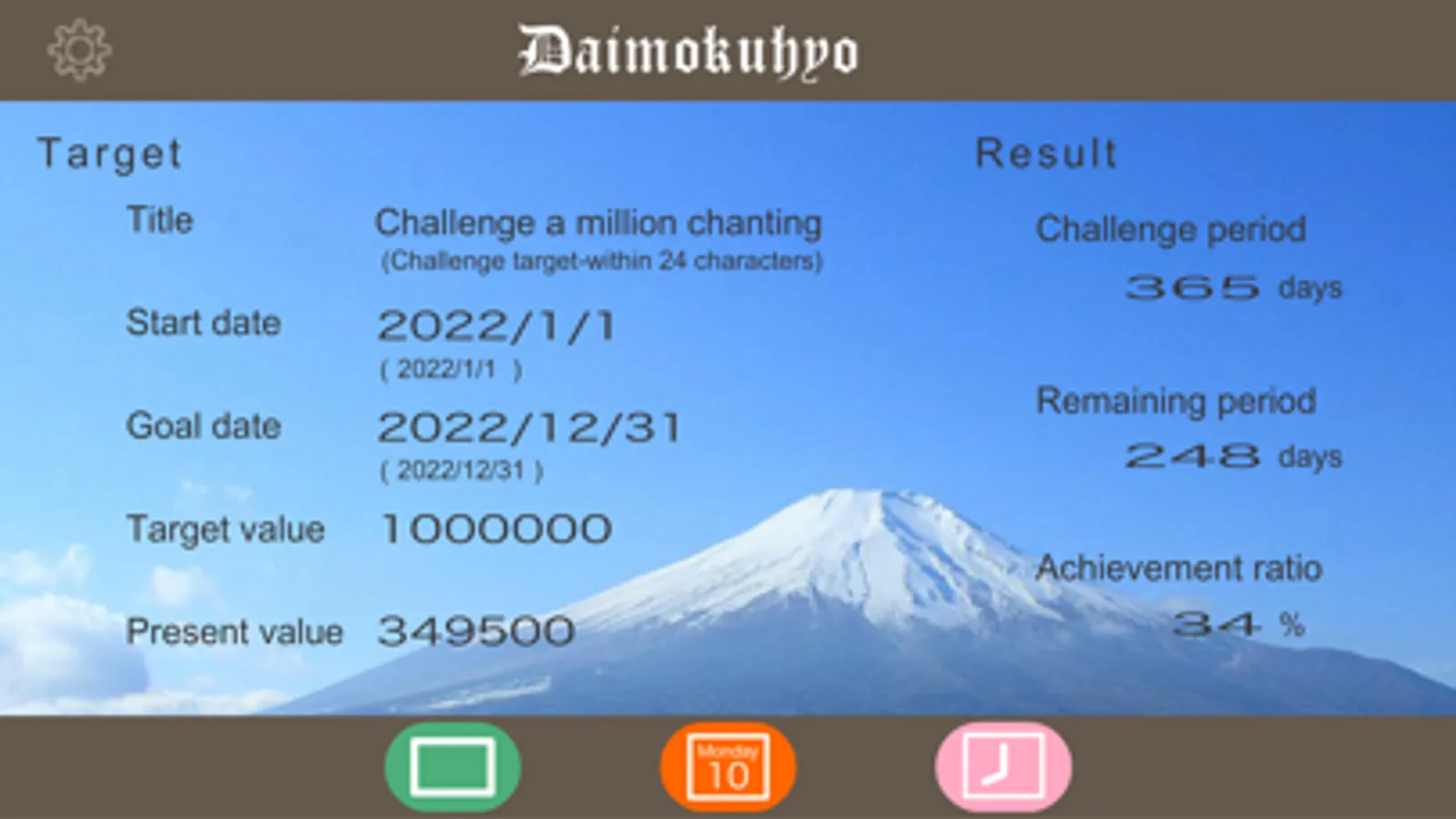 ・Tap the "T" button to return to the first top screen, and the "current value" reflects the cumulative number of recitations up to the present obtained with the calendar tool, "remaining period", "challenge period", and "achievement rate" Is automatically calculated and displayed.
