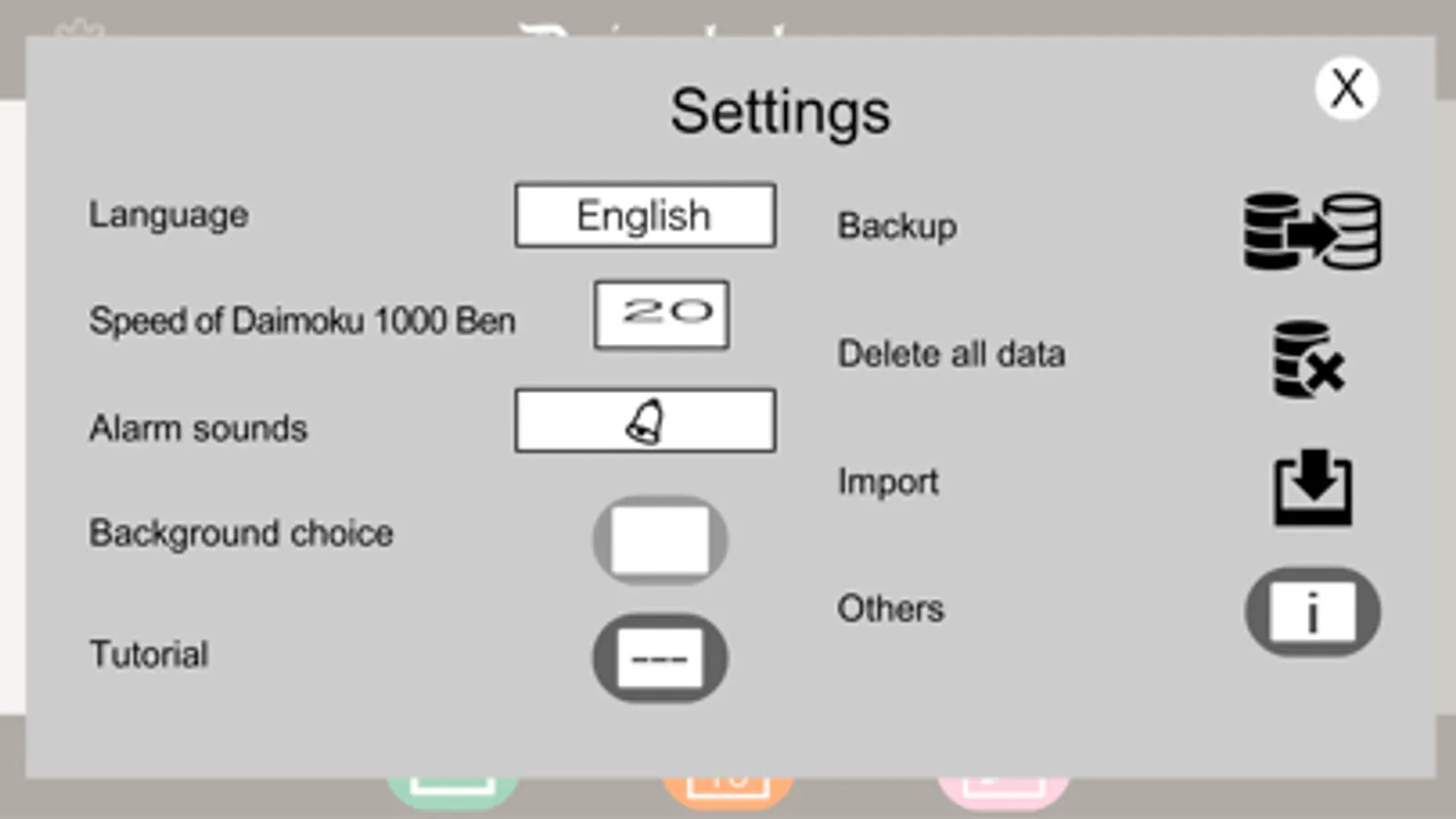 ・ "Language", "Title 1000", "Alarm sounds", "Background", "Tutorial", and "Other". Please make settings while tapping each.
