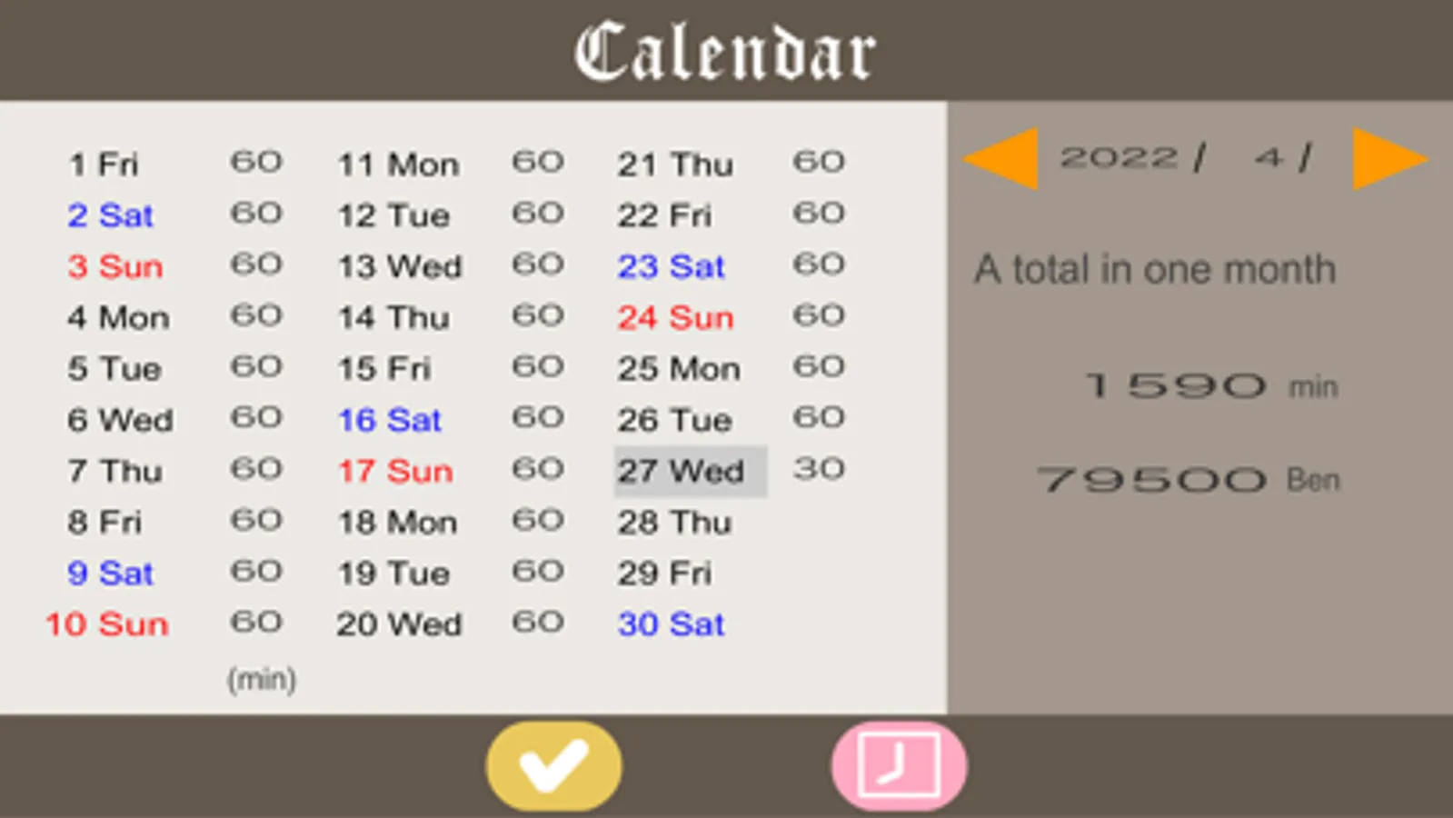・Tap the "Calendar" button to display the calendar tool screen, and the time counted by the timer tool is displayed in the date field of the day(Round down to minute).